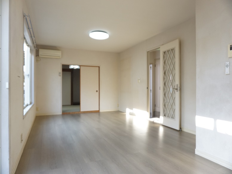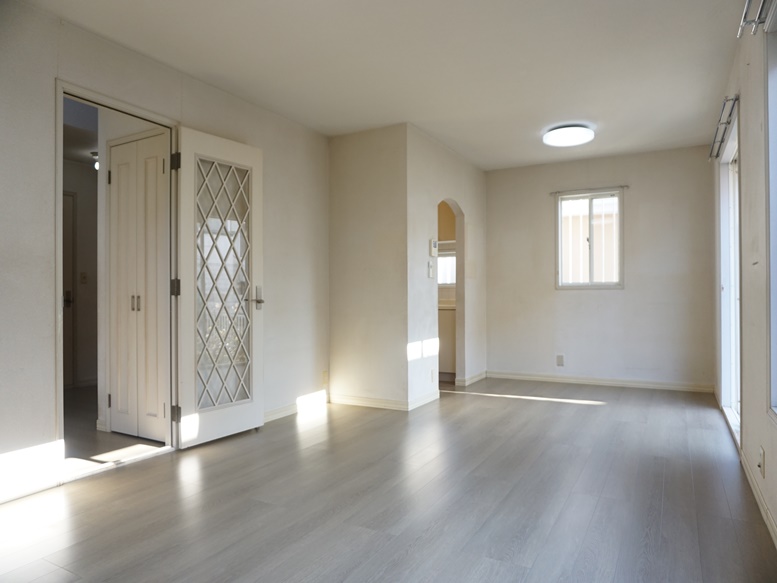 構造躯体がしっかりとした平成初期の建物だったため、表層部分の軽微な補修のみにとどめました。リビングの陽当たりが良く、もともと茶系色の床だったものを、白色の強めの床に変更することで、光の反射を利用し、室内奥のキッチンや廊下まで陽が届くようにしてみました。