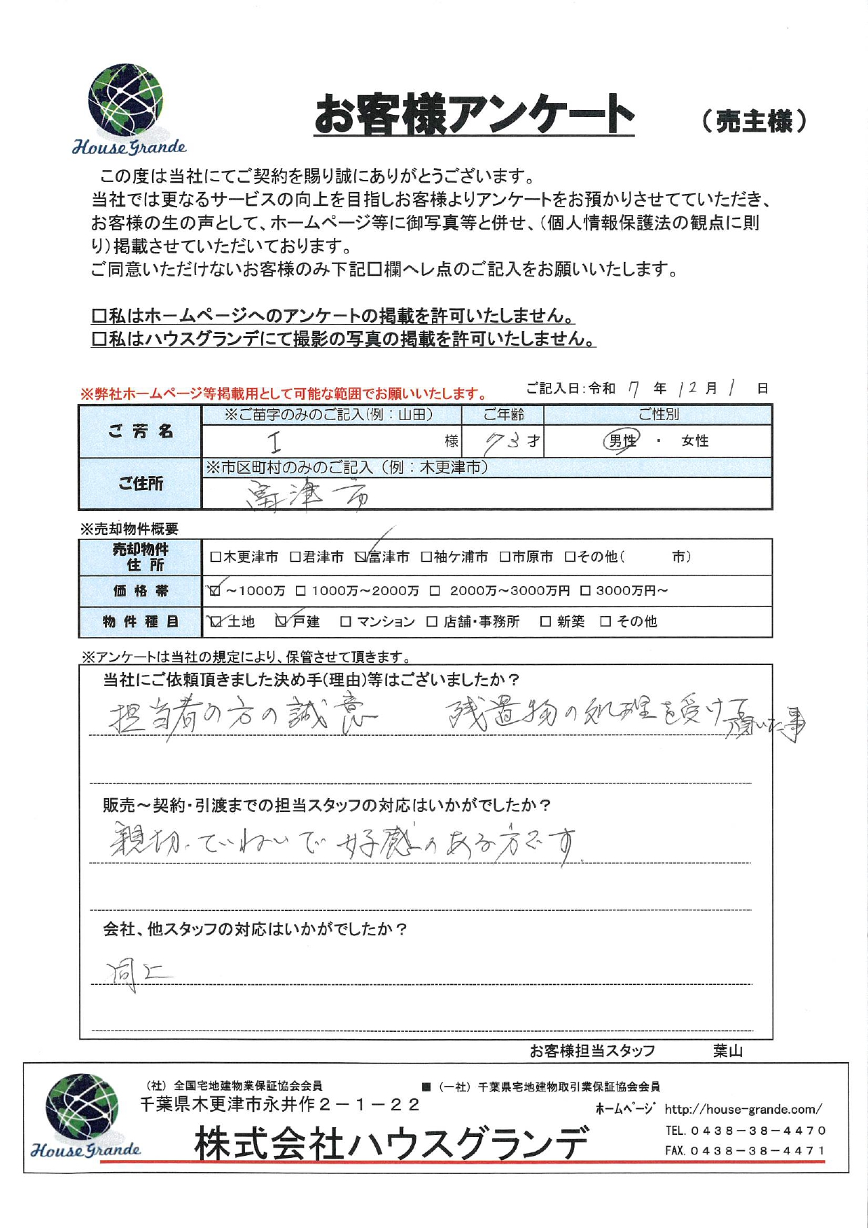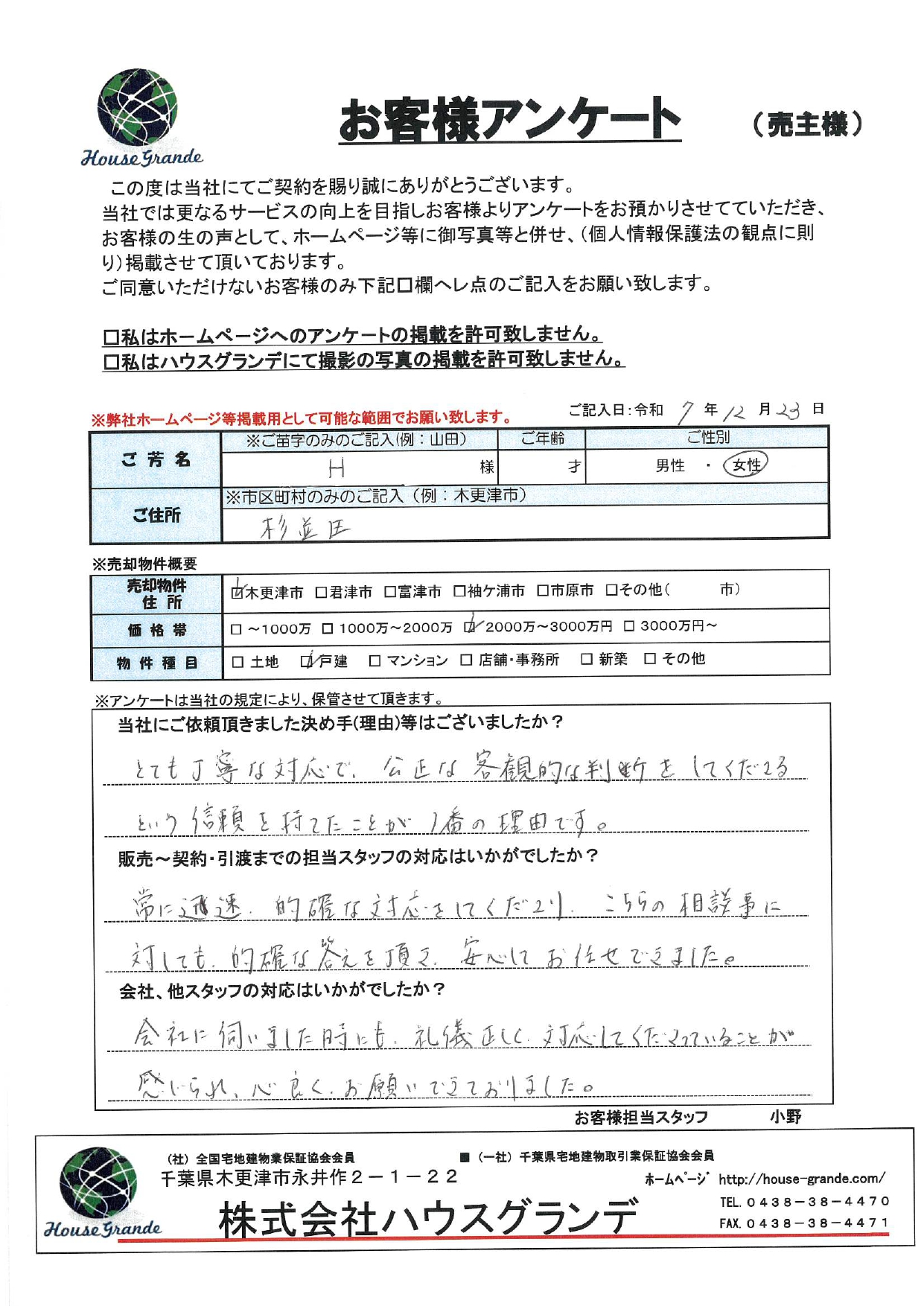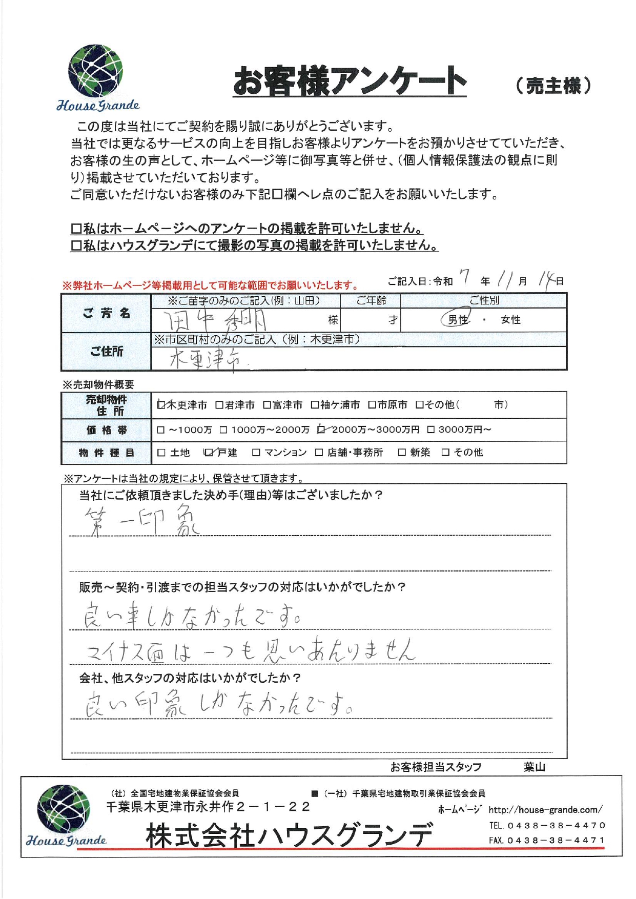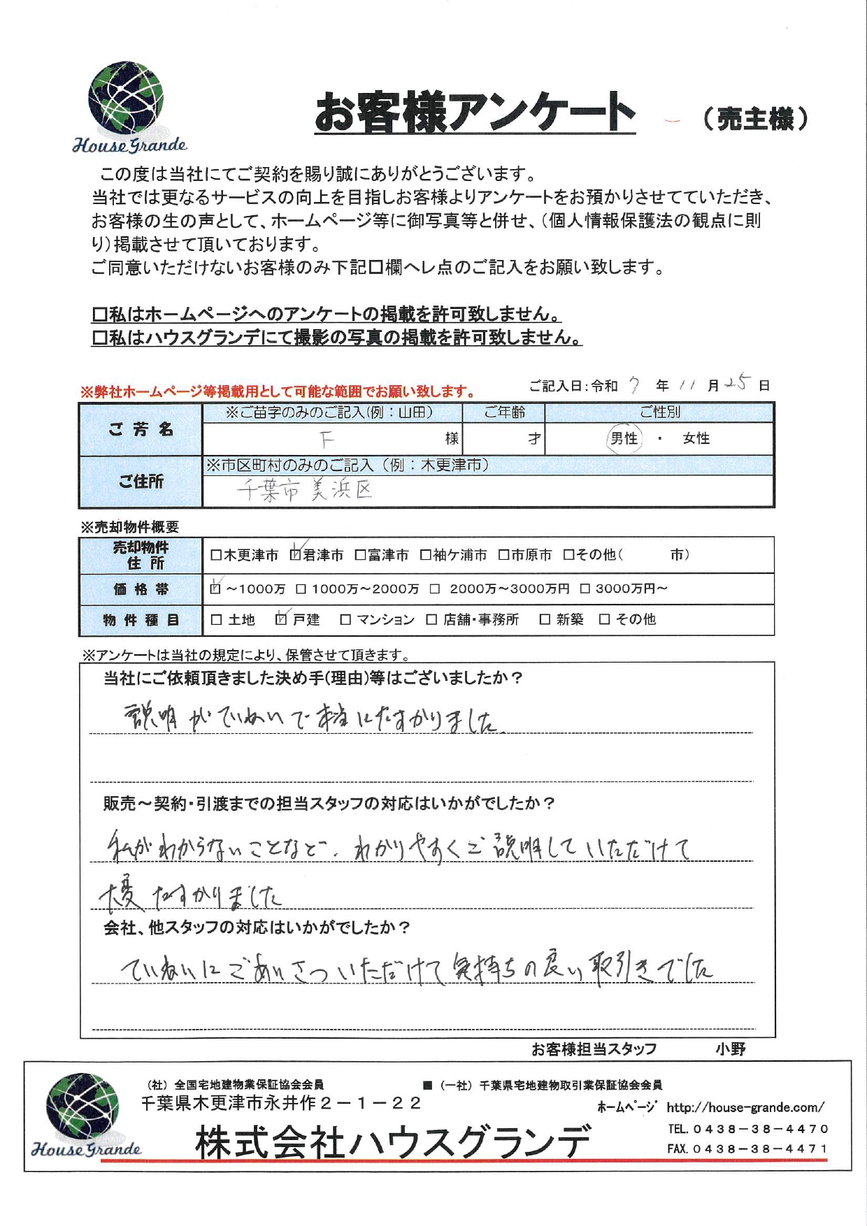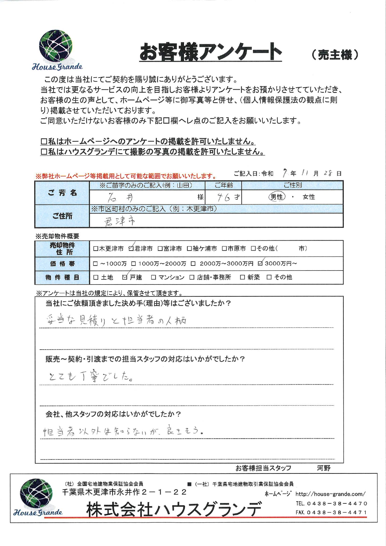 河野この度は大切な資産のご売却について、弊社ハウスグランデにご依頼をいただきまして本当にありがとうございました。